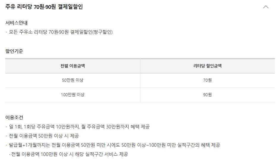 매월 소비금액에 주유를 많이 하는 사람에게 맞는 카드라고 할 수 있습니다. 주유할인은 전월 실적 50만원 이상시 70원, 100만원 이상시 무려 90원까지 리터당 할인이 됩니다. 그리고 전월실적 50만원 이상시 스피드메이트에서 연 2회 엔진오일 교환시 20,000원 현장 할인과 차량 안전점검, 타이어 펑크 수리, 터이어 위치교환을 각각 연1회 받을 수 있습니다.