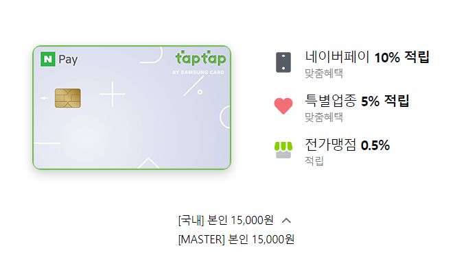 삼성카드 세번째 인기카드 네이버페이 taptap 카드는 일상패키지와 온라인패키지 중 하나를 선택하여 혜택을 받을 수 있습니다. 카드의 이름과 같이 네이버페이를 자주 사용하는 분들이라면 매우 현명하고 좋은 선택이 될 수 있습니다.