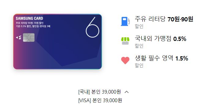 매월 소비금액에 주유를 많이 하는 사람에게 맞는 카드라고 할 수 있습니다. 주유할인은 전월 실적 50만원 이상시 70원, 100만원 이상시 무려 90원까지 리터당 할인이 됩니다. 그리고 전월실적 50만원 이상시 스피드메이트에서 연 2회 엔진오일 교환시 20,000원 현장 할인과 차량 안전점검, 타이어 펑크 수리, 터이어 위치교환을 각각 연1회 받을 수 있습니다.