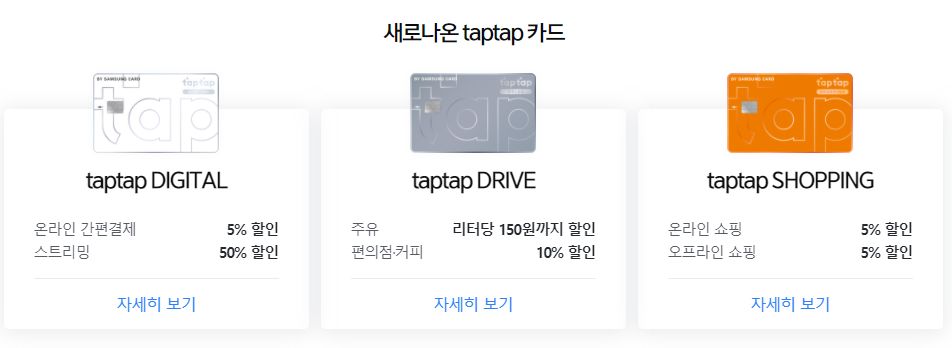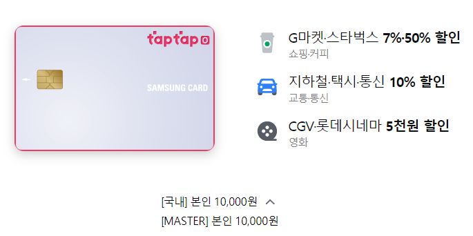 삼성카드 중 인기순위 부동의 1위를 차지하며 많은 사람들의 선택을 받는 카드입니다. 특히 taptap O 카드는 20, 30대 사회 초년생들이 사용하기에 가장 적합한 신용카드입니다. 전월실적 30만 원 조건을 채우면 젊은 사람들의 주요 소비군인 교통, 통신, 커피, 쇼핑, 영화 등에서 다양한 혜택을 제공합니다. 교통할인과 통신할인은 각각 월 5천원까지 할인이 제공되고, 스타벅스 50% or 커피전문점 30% 할인, 트렌디쇼 7%할인을 통해 유용하게 이용할 수 있습니다.