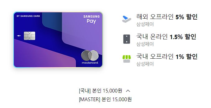 두번째 삼성페이카드의 가장 큰 장점은 전월실적, 할인한도에 상관없이 국내 0.5%, 해외 1.5% 할인 된다는 점입니다. 추가로 전월실적 30만원을 충족하면 국내 오프라인 1%, 온라인 최대 1.5%, 해외는 오프라인 사용시 최대 5%까지 할인 혜택이 올라가게 됩니다. 무엇보다 기본 할인에 대한 실적 조건이 없는 점이 좋고, 월 할인한도가 30만 원이기 때문에 넉넉히 할인 혜택 받을 수 있습니다.