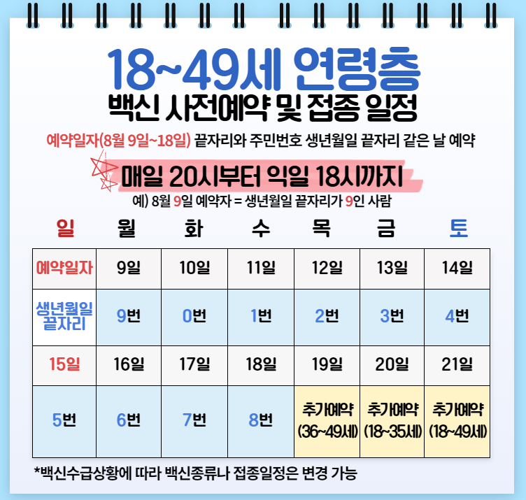 혹시 예약기간을 놓친다면 추가예약이 가능합니다. 8월 19일 36~49세, 8월 20일 18~35세, 8월 21일 18~49세, 8월 22일 부터는 나이에 관계 없이 추가 예약 또는 변경을 할 수 있습니다.