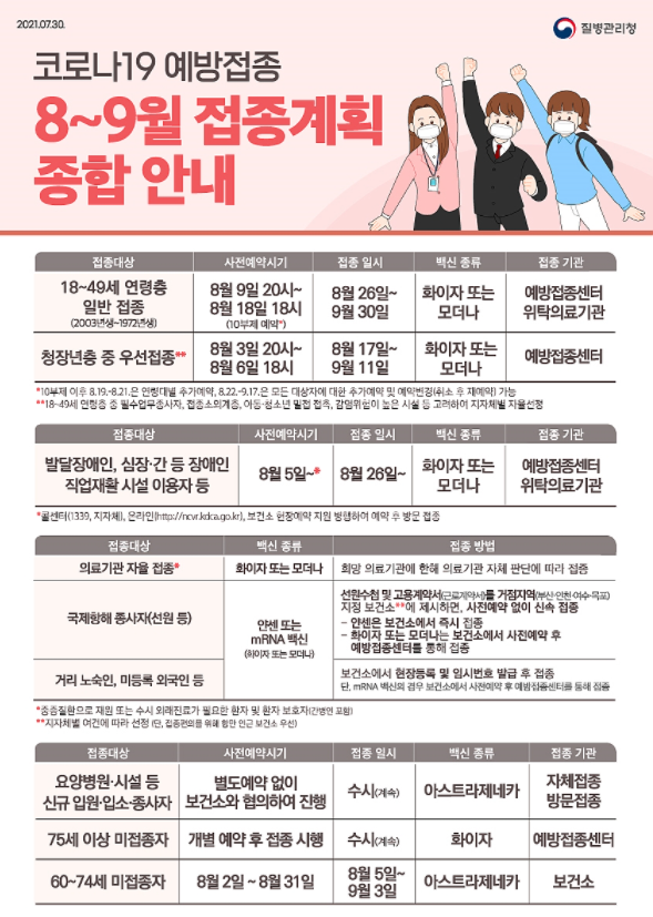 또한 우선접종 대상자로는 대중교통, 택배, 환경미화 등 필수업무 종사자와 아이들과 접촉인 많은 학원강사는 8월3일부터 사전예약을 시작합니다. 예약 분산을 위해 지역별로 예약 일정을 나눠 3일은 수도권, 4일은 수도권 외 시도, 5~6일은 전 지역에서 예약할 수 있습니다.