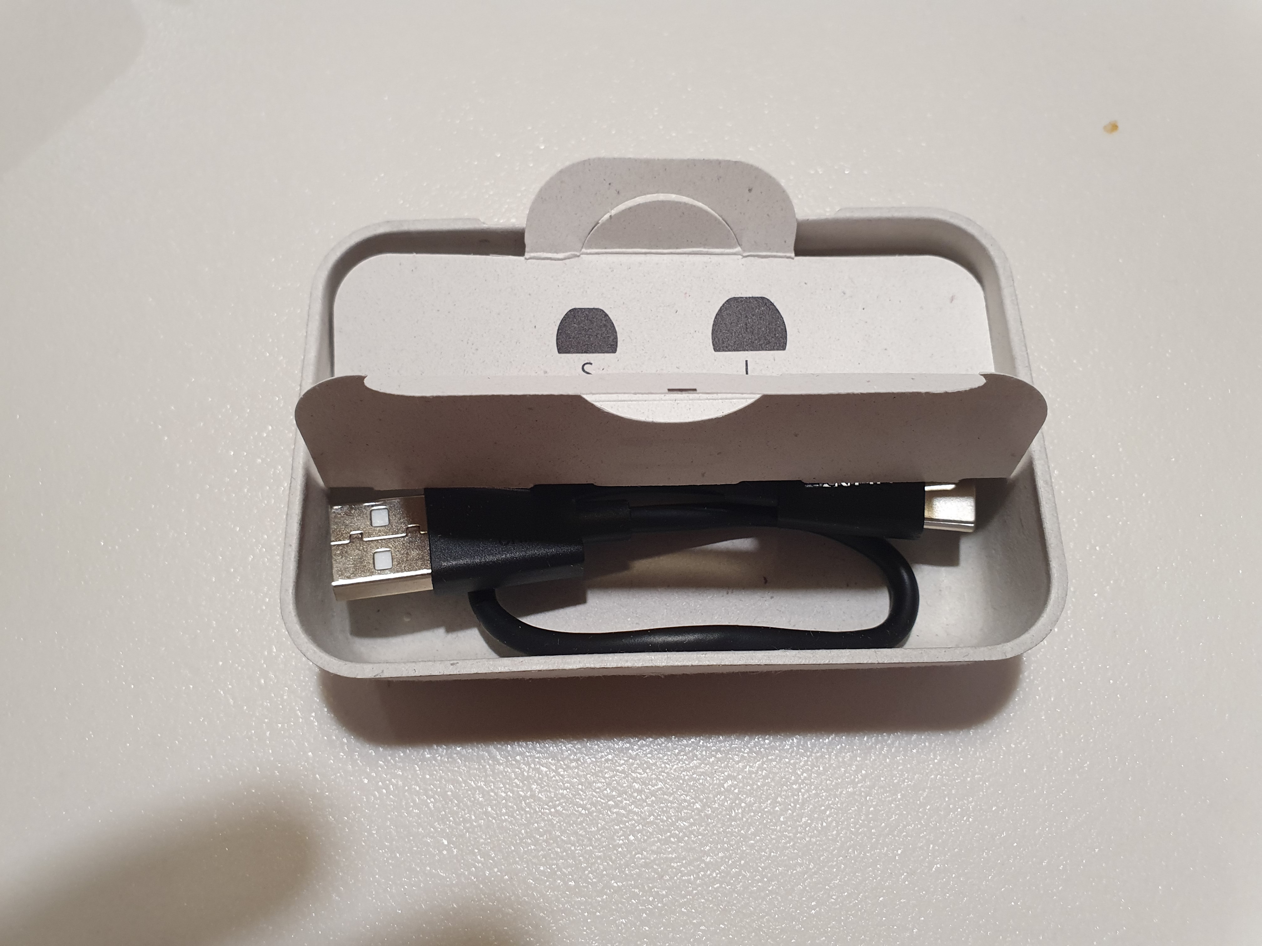 구성품은 이어버드가 포함된 충전 크래들과 추가 이어 팁 2쌍, USB A to C 케이블이 들어있습니다. 친환경 소재만으로도 상당히 완성도 높은 패키지를 만들어냈다고 할 수 있습니다. 세 쌍의 노이즈 아이솔레이션 이어팁은 S, M, L 세 쌍이 포함되어 있어 사용자에 맞게 변경하여서 사용하면 됩니다. 자세히 보면 내외부가 각각 다른 소재가 적용되어 있는데, 폴리우레탄 재질의 폼팁과 실리콘 소재의 장점을 조합했는데 이 때문에 차음성과 음질이 좋지 않나 생각이 듭니다.