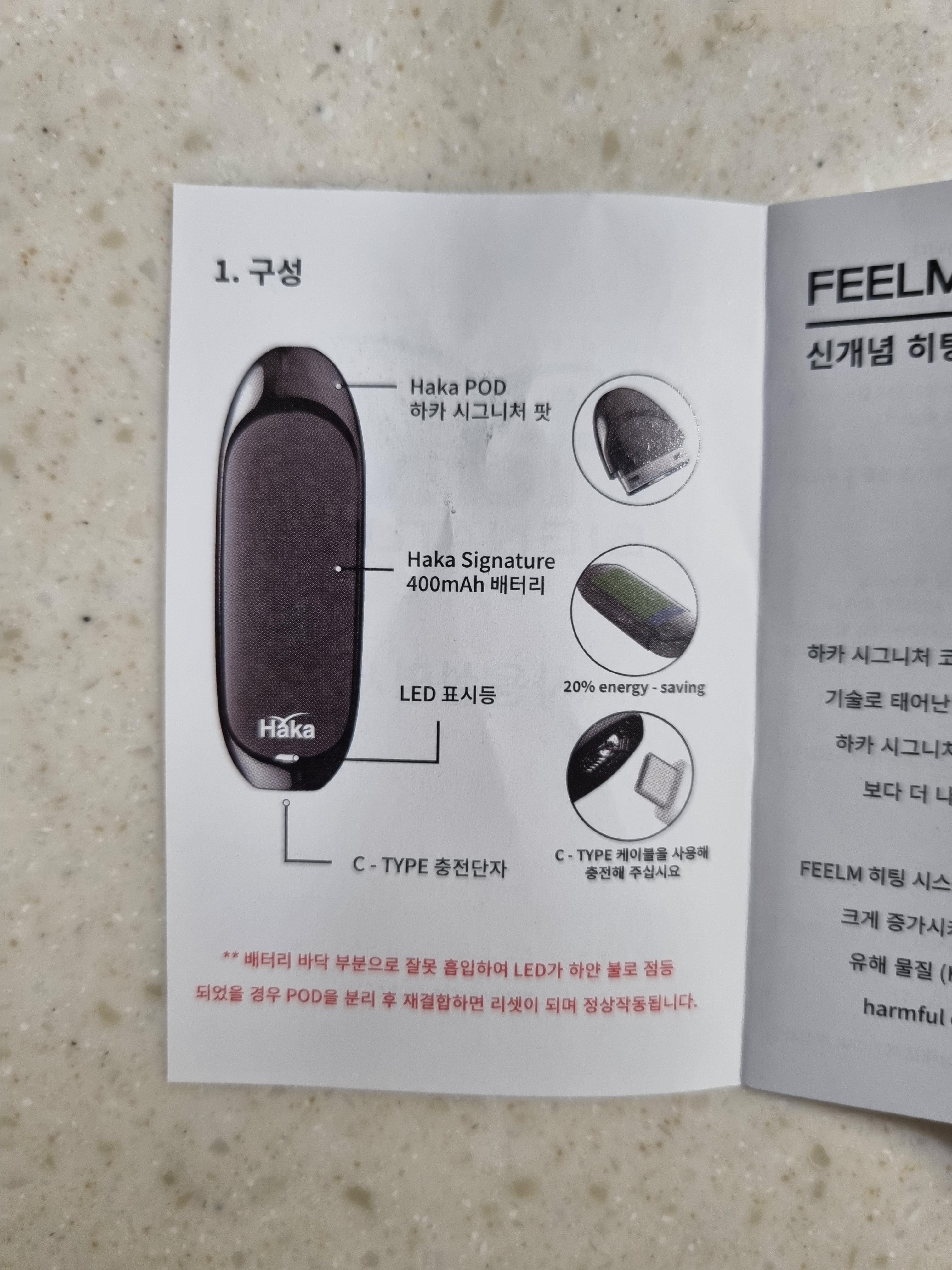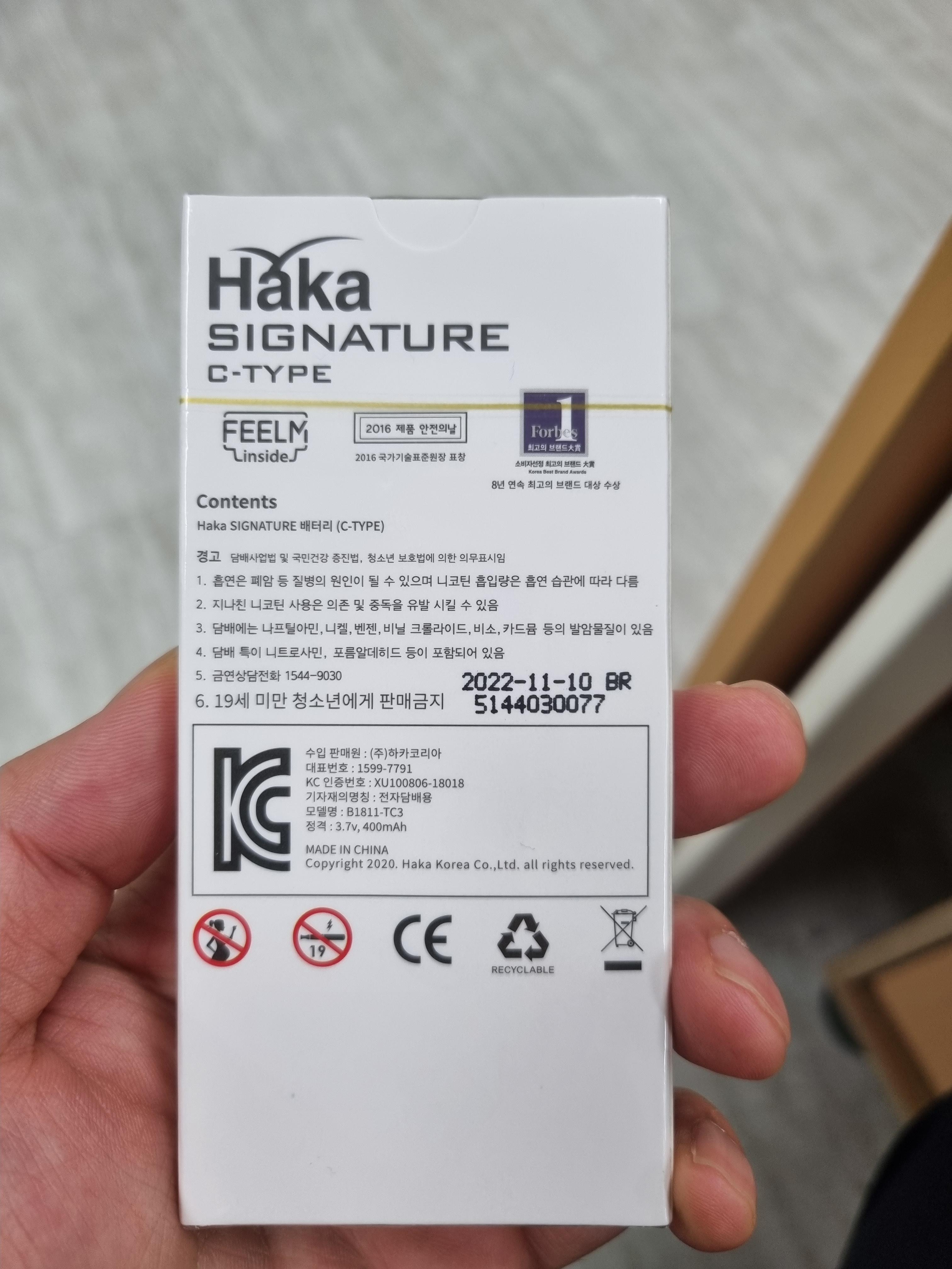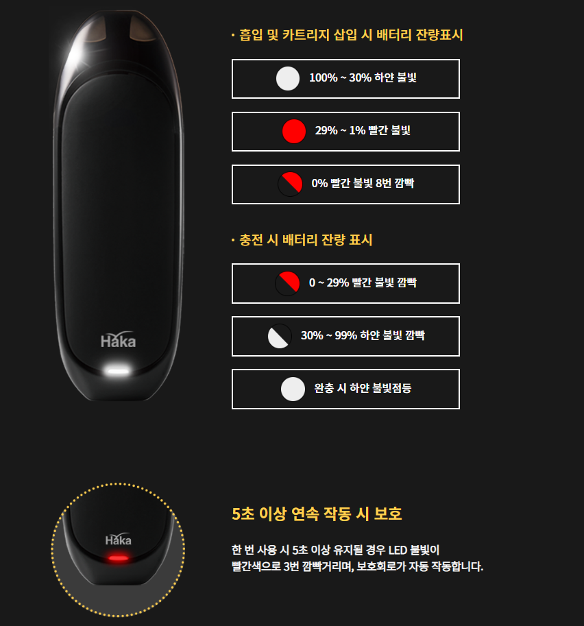 앞서 말한 것 처럼 하카 시그니처 크기는 베이핑 시 최적의 그립감을 제공하기 최적의 크기라 생각하며 적당한 사이즈로 휴대 하기도 매우 용이합니다. 불과 얼마 전까지 연초 담배곽에 라이터를 들고 다녔던 것을 생각하면 매우 편리합니다. 회사에 따르면 기기 외관을 만드는데 소각시 유해물질이 발생하지 않는 친환경 소재를 사용했고, 내충격성과 내화학성을 가지고 있다고 합니다. 또한 외관에 충격으로 인해 문제가 발생시 PCB 파손이 없을 경우 외관만 교체하는 프리미엄 서비스를 제공하고있다고 합니다.