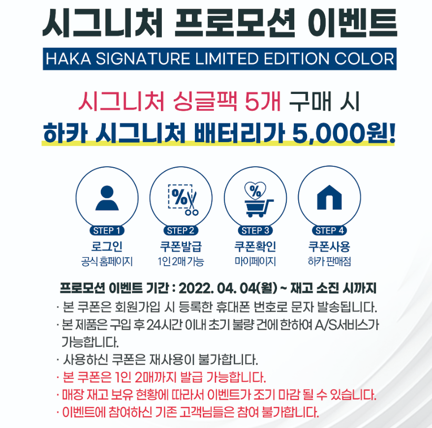 혹시 구매생각이 있다면 하카 홈페이지에 이벤트를 확인하셔서 쿠폰을 발급 받으면 하카 시그니처 제품을 저렴한 가격에 구매를 할 수 있습니다. 하카 시그니처는 액상 전자담배이고, 전용 액상팟 싱글팩을 5개(개당 8,000원) 구매하면 하카 시그니처 제품을 단돈 5,000원에 구매할 수 있는 이벤트가 진행 중이에요. 여기에 제품 케이스(6,000원)까지 포함해서 51,000원 거의 담배 한보루 값에 구매가 가능합니다. 저도 최근 추가로 한 셋트 더 구매했습니다.