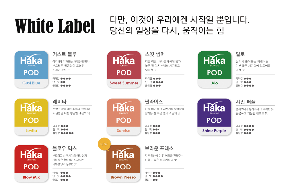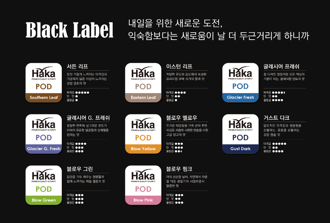 액상전자담배인 만큼 다양한 맛을 경험해볼 수 있습니다. 실제 연초의 흡연감을 100%까진 채울수는 없는 것이 사실이기 때문에 다양한 맛의 사용해보고 자신에게 맛는 것을 찾아 연초의 아쉬움을 달래는 것이 가장 중요해 보입니다. 하카 시그니처 전용 액상팟은 블랙라벨, 화이트 라벨의 종류로 구분하여 많은 맛을 판매하고 있는데, 실 사용자와 판매점 사장님들에 따르면 포도맛인 샤인 퍼플, 복숭아맛인 썬라이즈, 담배맛인 이스턴 리프 등이 인기가 많다고 하며 저 또한 위의 세가지 맛을 돌아가며 사용하고 있습니다.