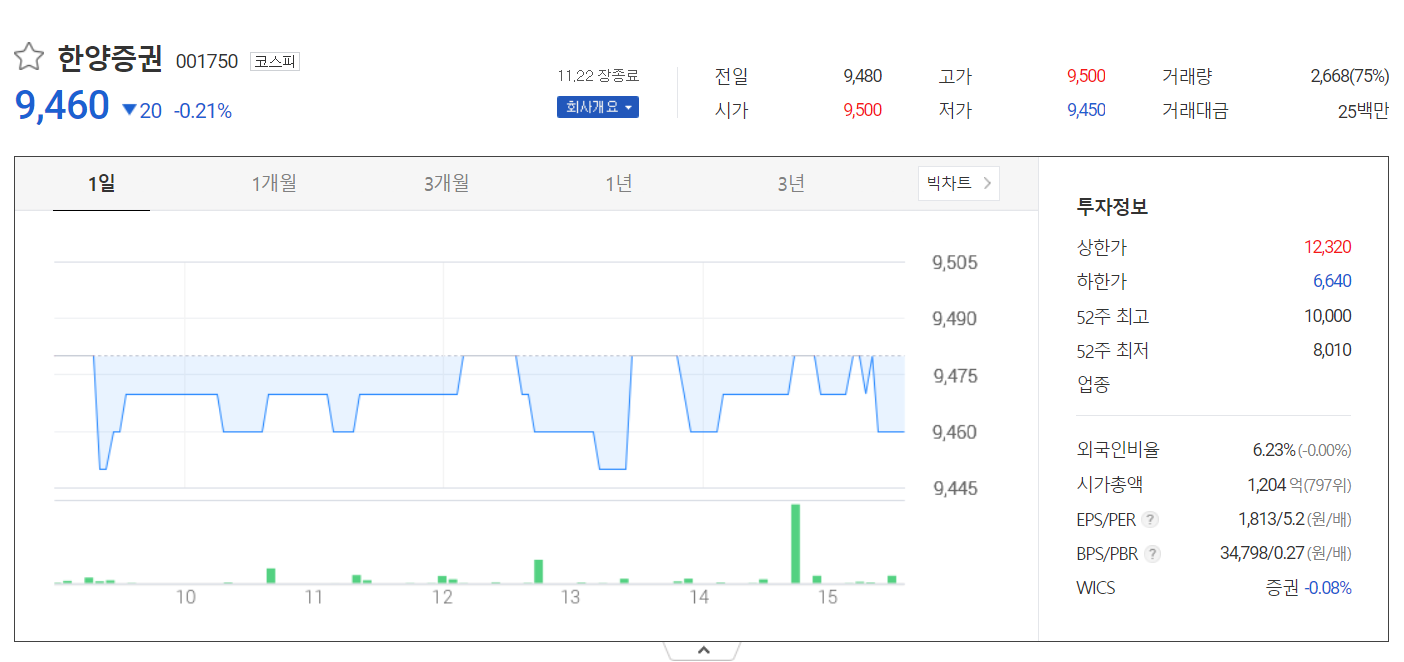 마지막으로 한양증권입니다. 배당주에 대한 관심이 금융지주사 뿐만 아니라 증권사도 관심을 가질 필요가 있습니다. 그중 한양증권은. 작년에 배당금이 800원이었고 이는 무려 배당수익률이 8.43% 였습니다. 하지만 증권사들의 경우 금융지주사에 비해 PF부실 사태 등 이슈가 발생할 수 있기 때문에 조심해야 합니다.