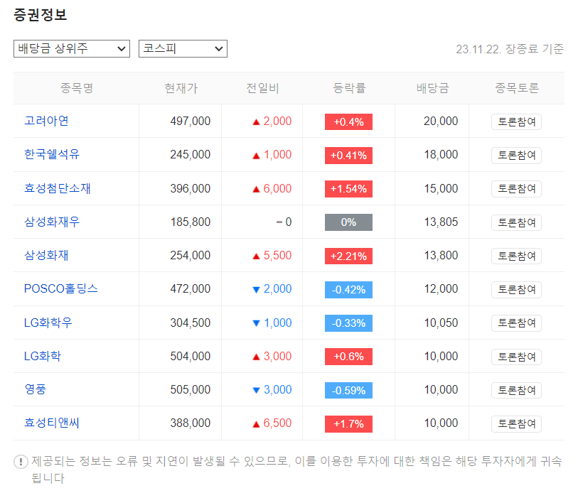 우선 포털사이트 '배당금'이라고 검색만 국내 주식 중 배당금 상위주식을 쉽게 확인할 수 있습니다. 배당금은 단순히 주당 금액만 높은 주식만 찾는 것이 아닌 주당 얼마의 배당금을 줄 것인지 배당수익률이 가장 중요하다 할 수 있습니다. 여기서 배당수익률이란 배당금을 주가로 나눈 것을 말합니다. 그렇다면 국내 주식 중 배당금 높은 주식 추천, 국내 배당주 순위 등을 알아보겠습니다.