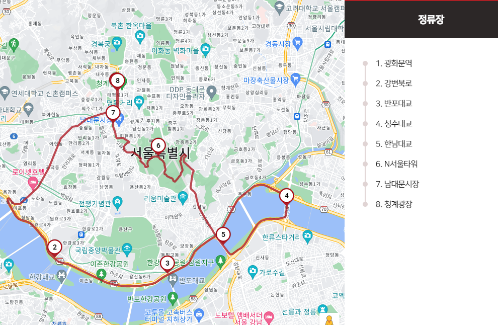 도심고궁남산코스의 가장 큰 장점은 투어 코스가 순환코스로 되어 있어 자신이 예약한 시간이 아니더라도 정류장에서 하차, 탑승이 가능해 원하는 관광지를 선택해 이용할 수가 있습니다. 놀이동산의 자유이용권 처럼 버스 티켓을 발권하면 하루 동안은 도심고궁남산코스를 순환하는 버스를 자유롭게 이용이 가능합니다. (전좌석은 미지정 좌석, 선착순 탑승)