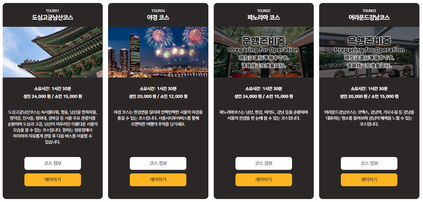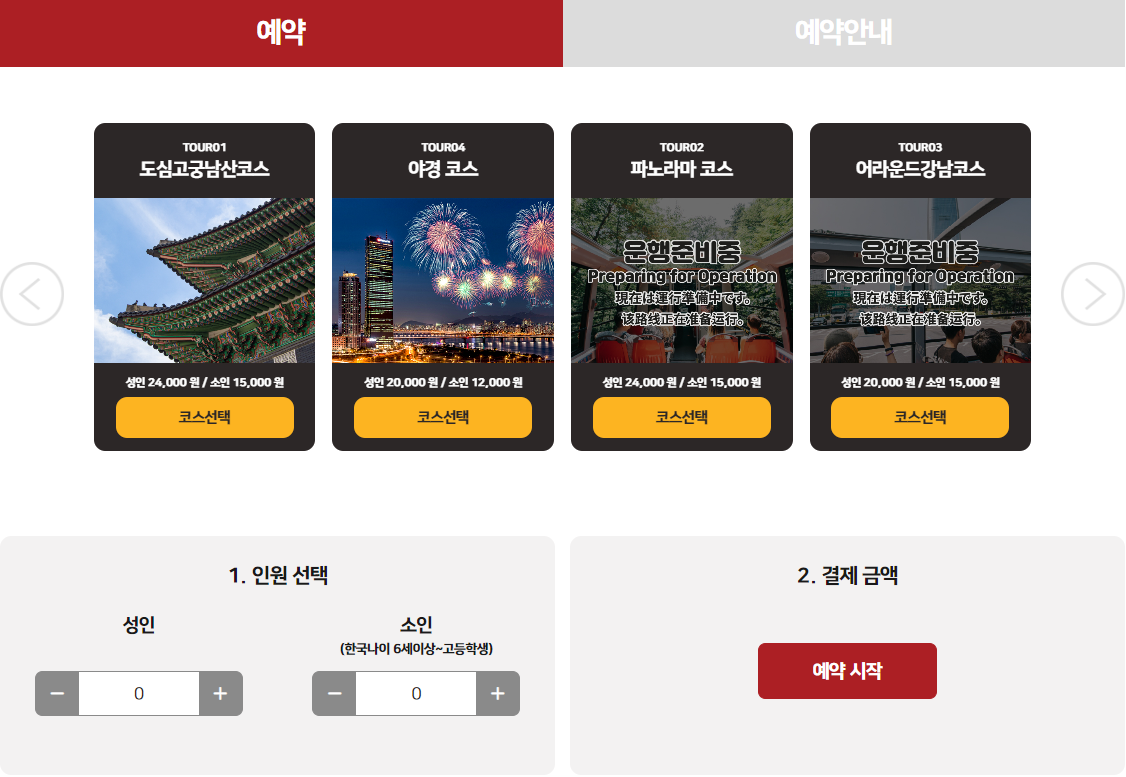 ◇ 당일 온라인 예약은 불가 / 도심고궁남산코스(TOUR01)는 당일 현장 구매가 가능 / 야간코스(TOUR04)는 방문 전 고객센터에 잔여좌석 문의