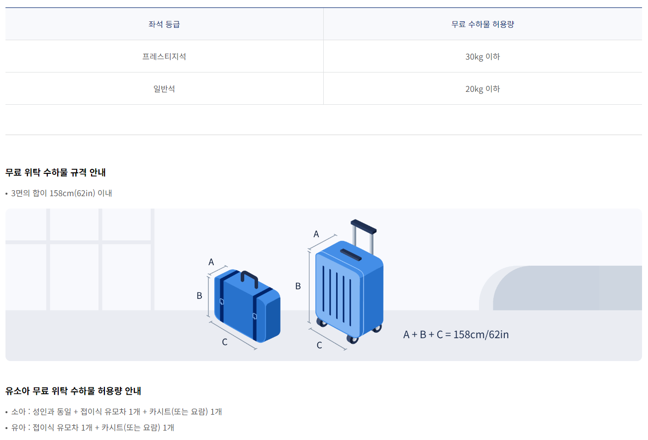 | 일등석 | 3개, 32kg | 3개, 32kg |