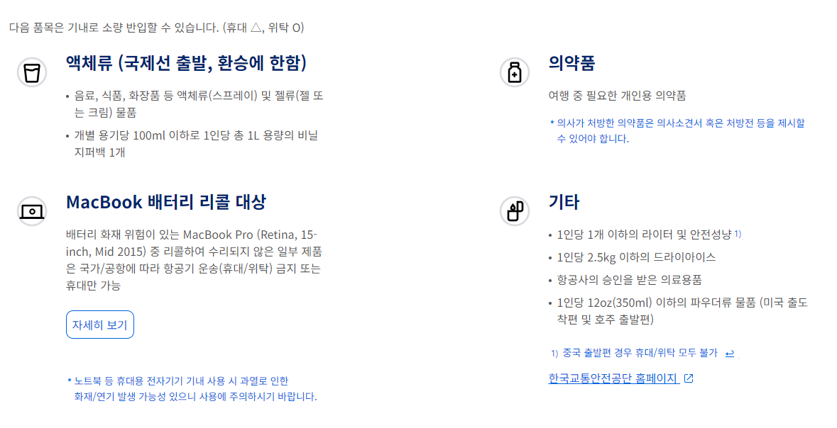 액체류의 경우에도 기내로 소량 반입할 수 있거나 없거나 하는 것 등이 있기 때문에 아래의 글을 참고해 탑승 전에 정리해서 잘 준비하시길 바랍니다.