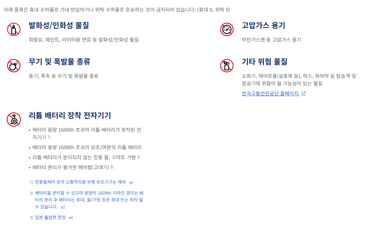 여행객들이 가장많이 헷갈려하는 물품 중 휴대전화 등의 필수품인 보조배터리는 위탁 수하물이 아니라 기내 반입 물품으로 오늘 소개해 드린 대한항공의 경우 100Wh 이하는 최대 20개, 100Wh 초과 160Wh 이하 2개까지만 반입이 가능합니다.