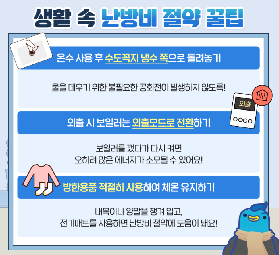 오늘 포스팅에서는 난방비 아끼는법 절약 꿀팁 등에 대해 알아봤습니다. 여름에는 전기세 걱정만큼 겨울의 가장 큰 걱정이 난방비 걱정인데요, 위와 같이 난방비 아끼는법을 이용한다면 그래도 난방비를 절약하는데 제법 도움이 될 것입니다. 모두들 이번 겨울도 건강하고 따뜻하게 보내시길 바랍니다.