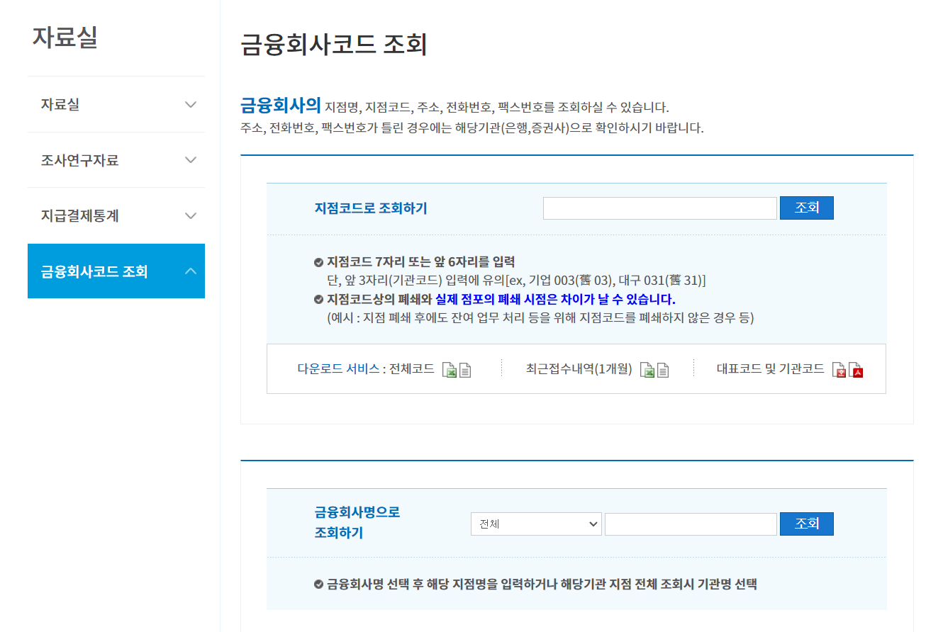 위의 국내주요은행코드 외에도 국내에는 2023. 11. 24. 기준 총 190여개의 금융기관이 운영중에 있습니다. 혹시나 자신이 찾는 은행코드번호가 위에 없다고 좌절하지 마세요 찾는 방법을 알려드리겠습니다. 먼저 포털사이트에 '금융결제원'을 검색해 들어가면 메인화면 우측상단에 '금융회사코드번호' 탭을 클릭해 들어가면 금융회사명으로 조회를 하거나 전체를 다운받아 확인해볼 수 있습니다. 추가로 자신이 거래하는 지점의 코드번호도 확인이 가능합니다.