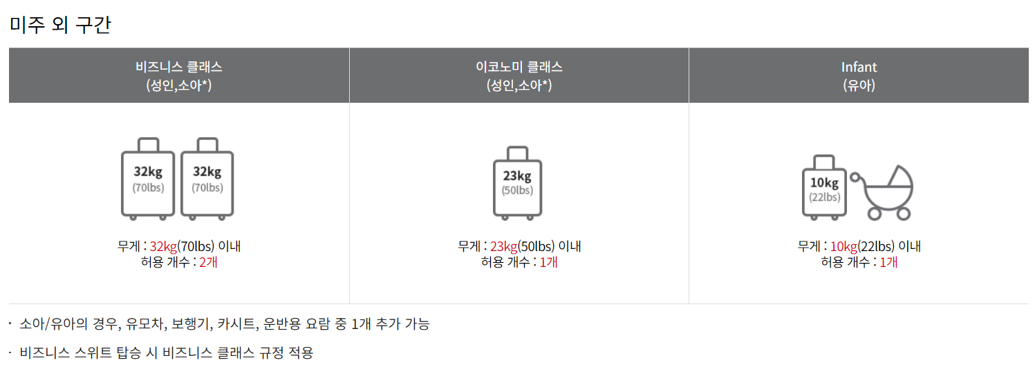 아시아나 미주주간의 비지니스 클래스는 무게 32kg 이내 수하물 2개를 허용하고, 등급이 낮은 이코노미 클래스는 23kg 이내 수하물 2개로 제한합니다. 유아와 함께 이용할 경우 유아용 유모차, 카시트 등의 허용 규격이 있으니 미리 확인하시길 바랍니다.
