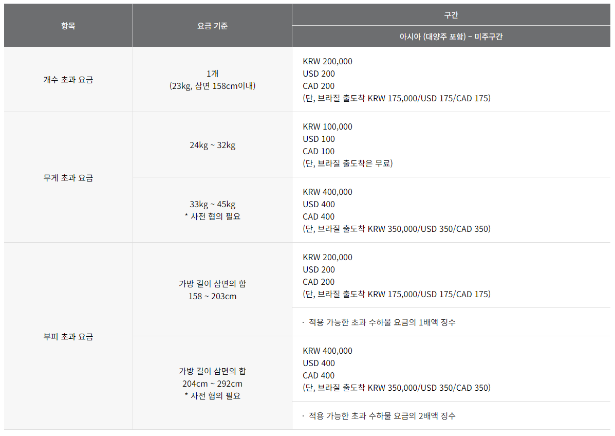 초과 수하물 요금은 수하물 개수와 무게, 크기 비행시간 등에 따라 편차가 있고, 해외에서 출발할 경우 현지 통화 사정 등에 따라 적용기준이 달라집니다