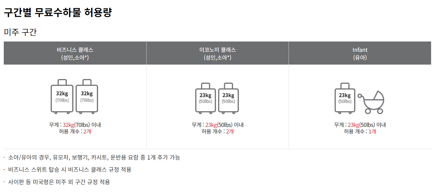 아시아나 미주주간의 비지니스 클래스는 무게 32kg 이내 수하물 2개를 허용하고, 등급이 낮은 이코노미 클래스는 23kg 이내 수하물 2개로 제한합니다. 유아와 함께 이용할 경우 유아용 유모차, 카시트 등의 허용 규격이 있으니 미리 확인하시길 바랍니다.