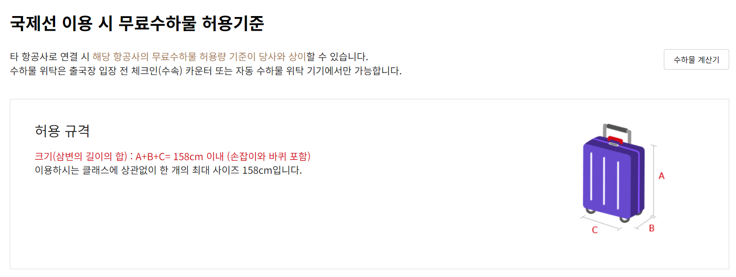 국제선 이용시 무료 위탁수하물의 경우 수하물 1개당 크기가 위와 같이 3면의 합이 158센티미터를 초과하면 안됩니다. 이는 승객이 이용하는 좌석의 등급과 무관하며 손잡이, 바퀴를 포함해 측정한 값입니다. 그리고 국내선 무료 수하물의 규격은 이코니미 클래스를 기준으로 무게 22kg 이하입니다.