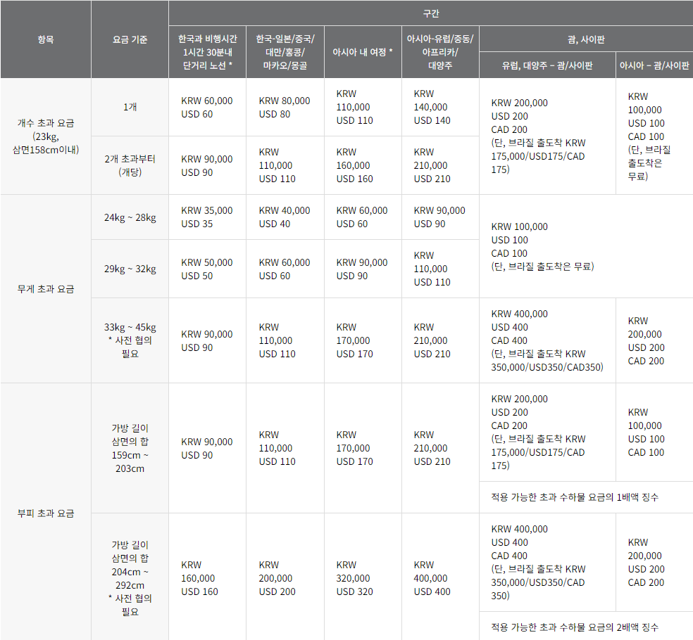 초과 수하물 요금은 수하물 개수와 무게, 크기 비행시간 등에 따라 편차가 있고, 해외에서 출발할 경우 현지 통화 사정 등에 따라 적용기준이 달라집니다