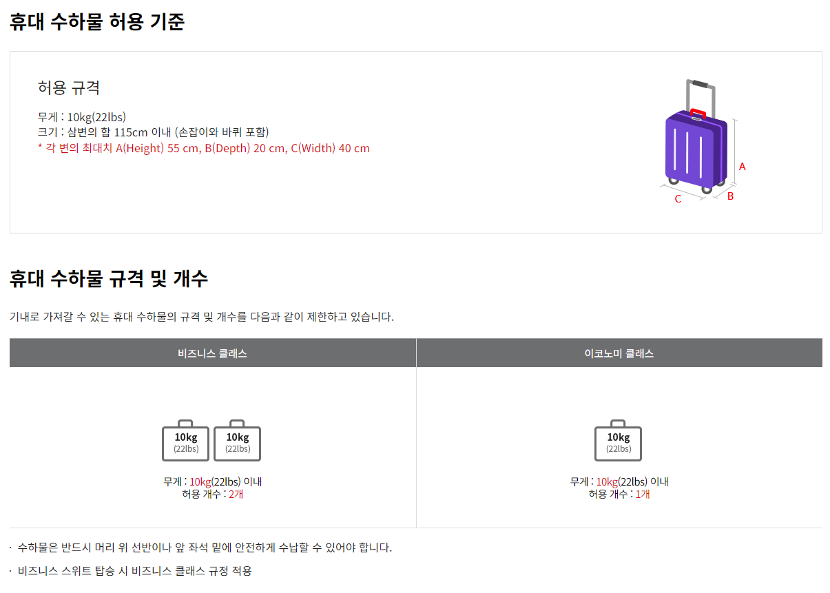 비지니스클래스의 경우 위 규격의 10kg이하 2개, 이코노미 클래서 10kg이하 1개를 휴대할 수 있습니다.