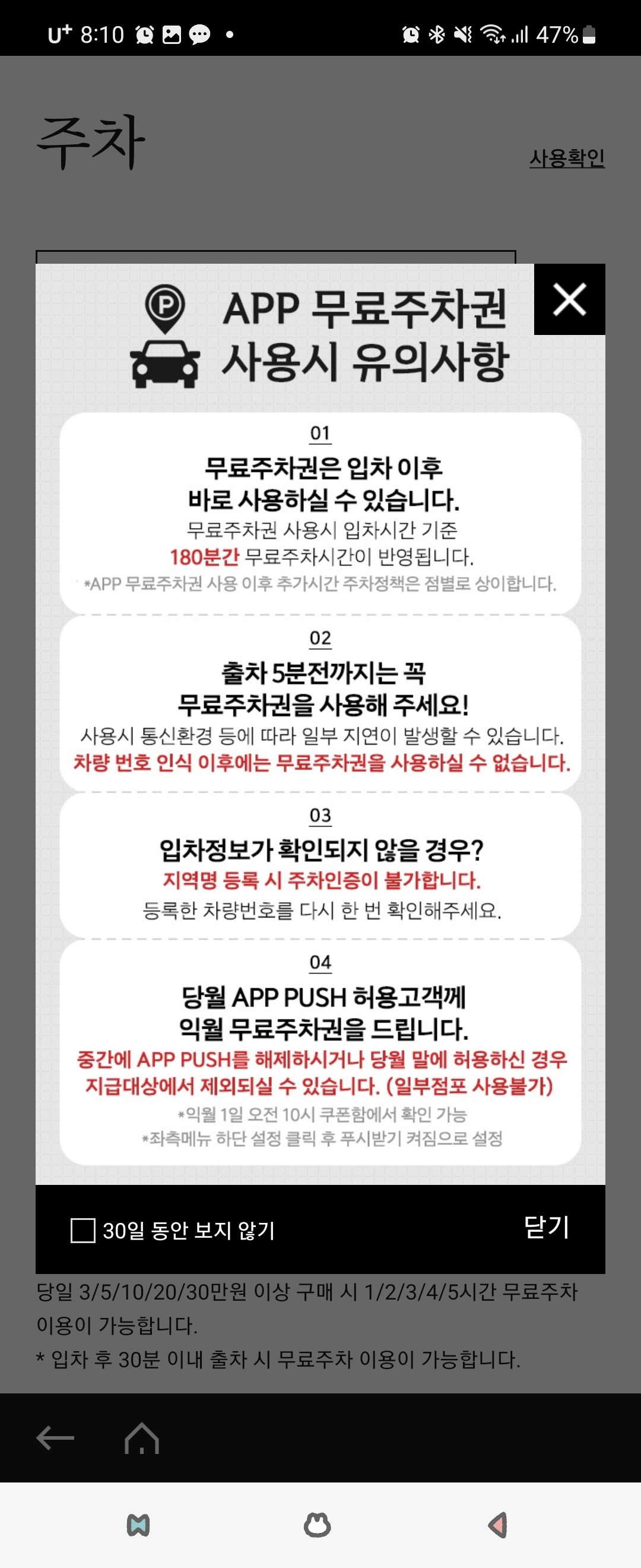 ▷ 당월 APP PUSH 허용 고객에 한해 익월 무료주차권 지급