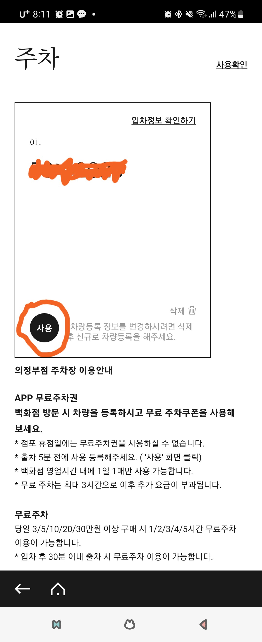 ▶ 위와 같이 회원가입 후 로그인하고 차량 등록을 완료했다면, 전산상의 지연 등의 문제로 출차 5분전에는 미리 무료 주차권 적용을 하여야 합니다. 사용방법은 주차한 신세계 백화점 지점을 선택하고, 지점 선택이 완료되면 '3시간 무료주차권 사용하기' 버튼을 눌려주면 할인 적용되고 정산이 완료되고 출차하면 됩니다.