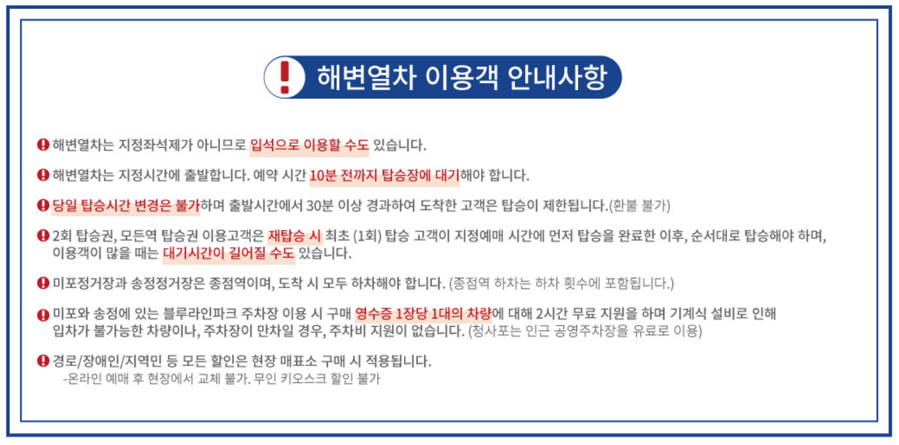 | ※미포정거장과 송정정거장은 종점역이며, 도착시 탑승객 모두 하차하여야 합니다. (종점역 하차는 하차횟수에 포함됩니다.) 왕복을 원하실 경우 2회 탑승권이나 모든역 탑승권을 구매하여야 합니다. ※평균속도 : 15Km/h 완속운행 (탑승시간 약 25분/편도) ※ 모든역 탑승권: 6개의 정거장을 한 번씩 내렸다 재 탑승 할 수 있는 탑승권 ※ 1회 탑승권: 어떤 정거장이든 1회 하차하면 사용이 종료되는 탑승권 ※ 2회 탑승권: 어떤 정거장이든 2회 하차하면 사용이 종료되는 탑승권 |