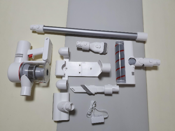 포장을 다 뜯은 샤오미 무선청소기 v9의 모습입니다. 청소기 본체, 봉, 벽면 거치대, 침구청소헤드 등등 정말 필요한것들