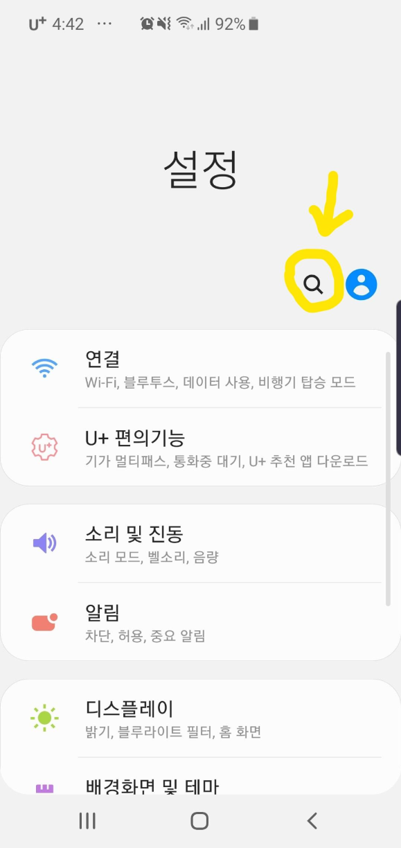 핸드폰 설정 들어가서 노란색으로 동그라미 쳐있는 돋보기 버튼을 누른후에