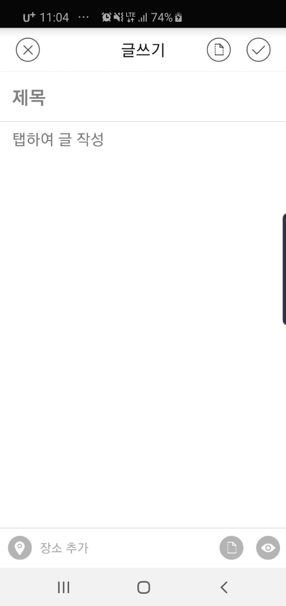 두둥 첫번째 사진과 달라진게 보이시나요?? 바로 핸드폰 하단에 장소추가 아이콘과 함께 임시저장글 불러오는 아이콘 그리고 그옆에 미리보기 아이콘이 나타났습니다!! 이걸 해결하는데 한 시간정도 걸린것 같습니다 ㅜㅜ