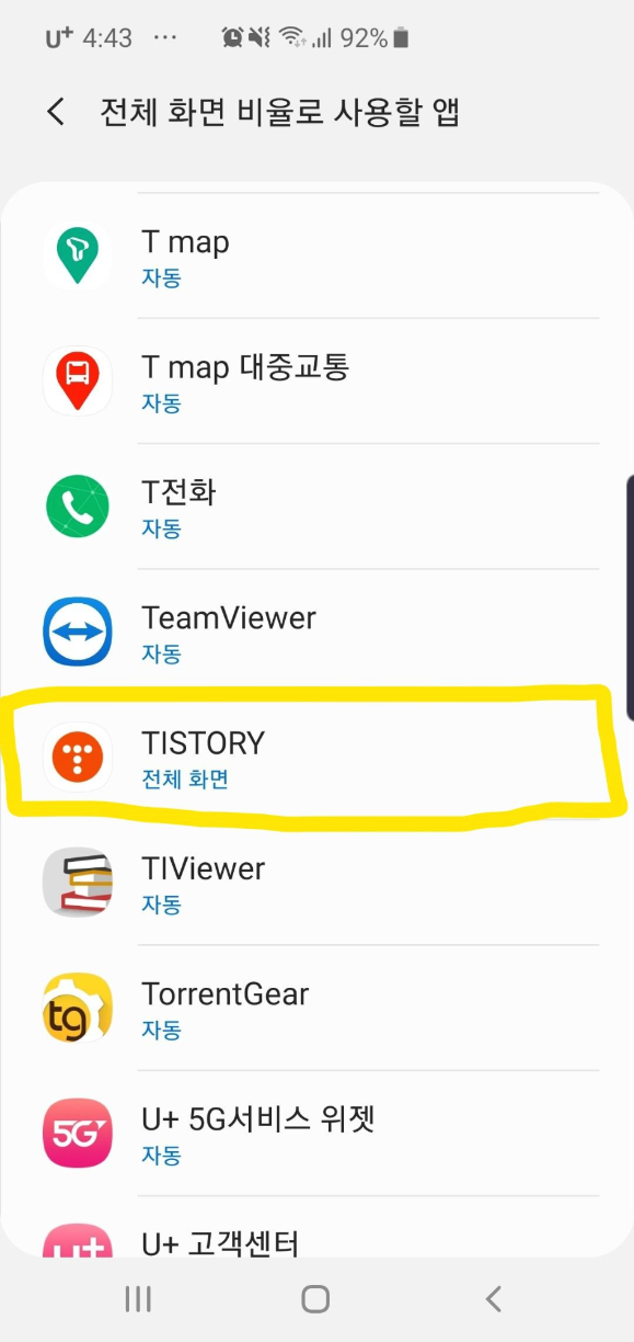 티스토리 앱을 찾아갑니다~ 앱에서는 TISTORY 영어로 되어있으니 밑으로 쭉쭉 가시면 되요~ 기본설정이 자동으로 되어있습니다. 다른앱들도 마찮가지네요... 자동설정을 전체화면 사용으로 변경!!